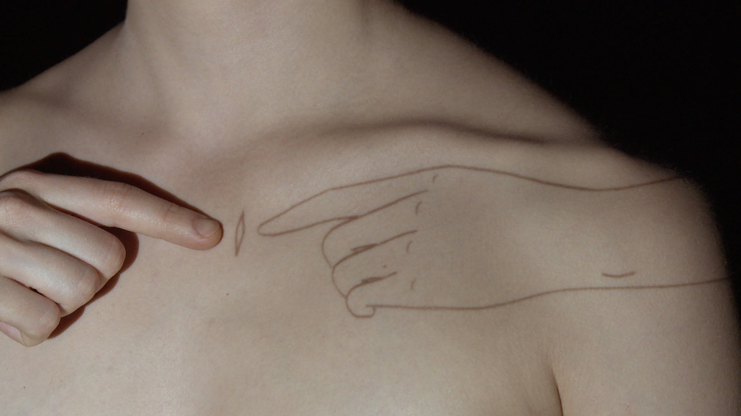 Berühren und berührt werden, sichtbar machen und verhüllen. Bleistiftlinien auf der Haut, eine innere Welt, die sich auf der äußersten Hülle offenbart. Aus Bewegungen und Gesten entsteht ein Zusammenspiel zwischen Körper und Zeichnung.