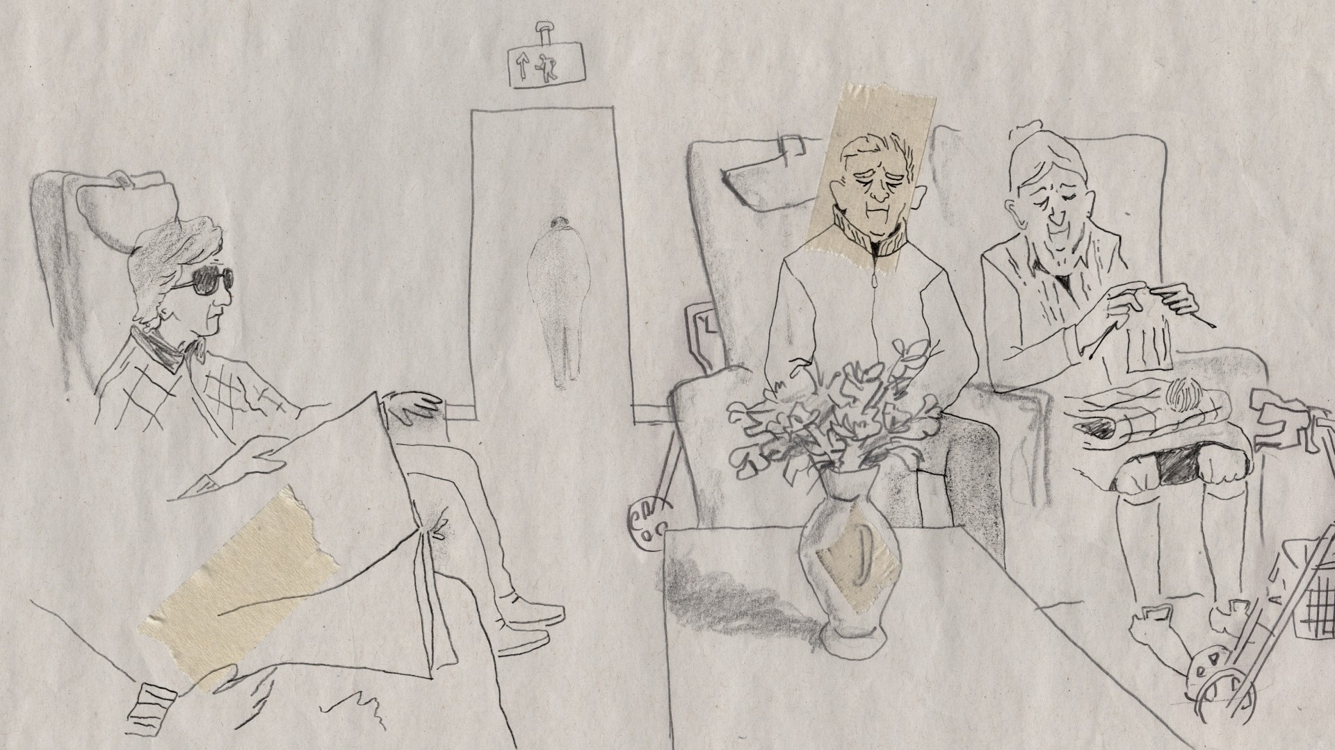 In the villa, time seems to stand still. Weakened bodies, nurses and a black cat move through the image. Cracks slowly appear. Suddenly, there’s a loud bang.