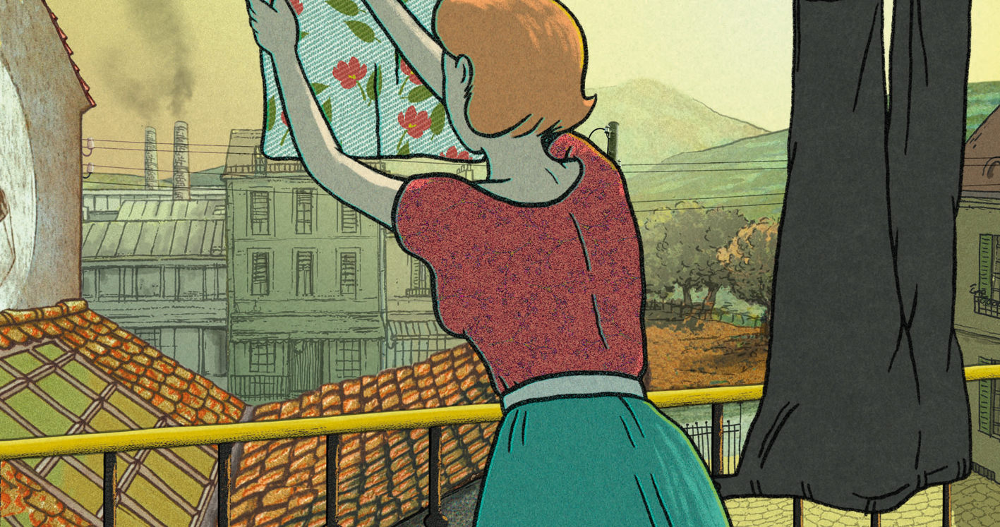 A person’s entire life – told from Ariane’s balcony. The washing on the line is a projection space for the developments in her life and society in general.